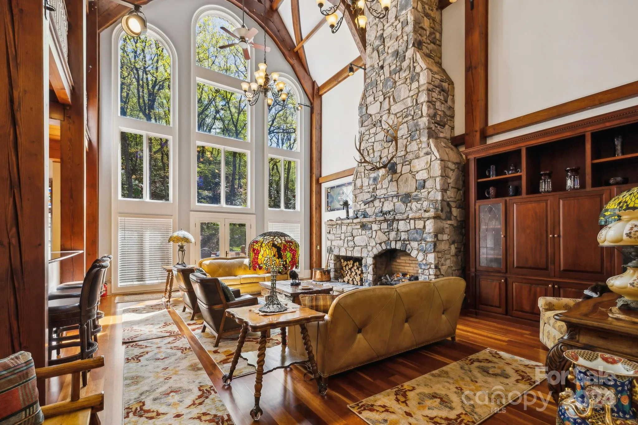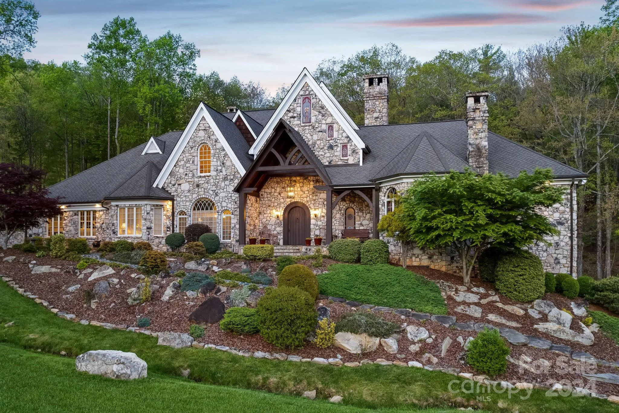 This exquisite estate near Boone, NC, and the Blue Ridge Parkway offers 128 deeded acres of unparalleled privacy and luxurious features. The Cumberland Fieldstone timber-frame home includes 5 bedrooms, 5 bathrooms, a stunning 38-foot great room ceiling, and a master suite with his-and-her baths, a jetted tub, heated floors, and a slate patio with a hot tub. Enjoy two year-round, spring-fed streams, potential ponds, abundant wildlife, and a private gated entrance with a 12-foot wide, all-concrete driveway. Features include a 3-car garage with 8-foot doors, a barn with a 2-car garage and loft, wood and slate patio, and immaculate landscaping. The home is equipped with a geothermal system with six units, 600 amp electrical system, and copper gutters. The walkout basement provides ample storage, a storm shelter, and a utility room with a poured concrete floor and humidifier. This one-of-a-kind property offers an extraordinary lifestyle. Contact listing agent for a full listing description.