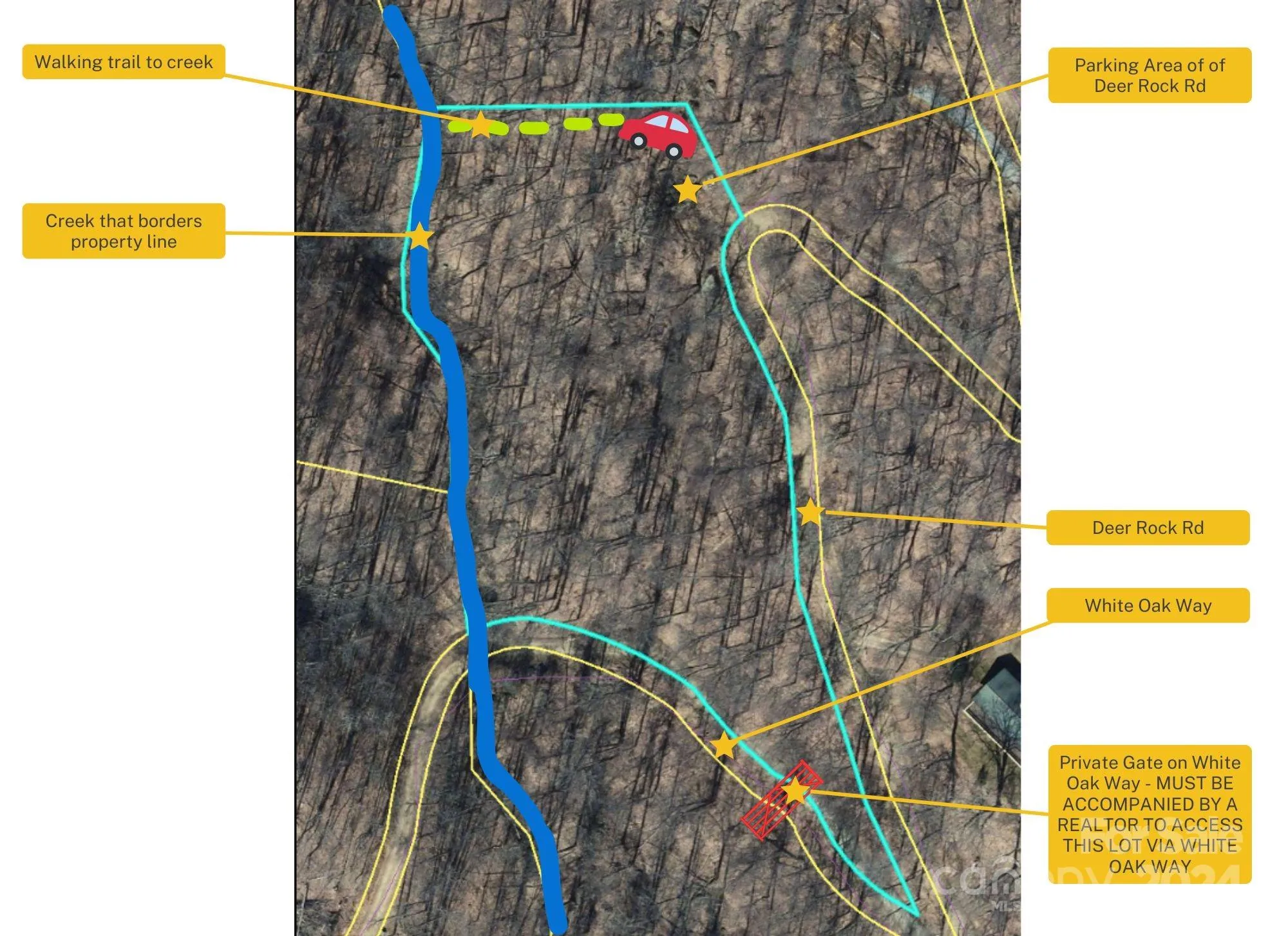 - From Asheville take I-26 towards Weaverville. Take exit 19A for US 25/ 70 towards Marshall and continue for 26 miles. Once in Hot Springs continue straight onto NC-209/ Lance Ave and continue for 7.2 miles. Turn right onto Meadows Fork Rd and continue 3 miles. Turn right onto Roaring Fork Rd (beginning of the subdivision) and continue for 1.1 miles. Take a left onto Cat Pen Branch and continue 1 mile. At the intersection of White Oak Way and Deer Rock Rd, take Deer Rock Rd to your right to access the parking area. The parking area will be a few hundred feet up Deer Rock Rd to your left. Buyers must be accompanied by a realtor to access the property via White Oak Way. There is a private gate for the property owners that live on White Oak Way and it will only be opened for those prospective buyers accompanied by a realtor.