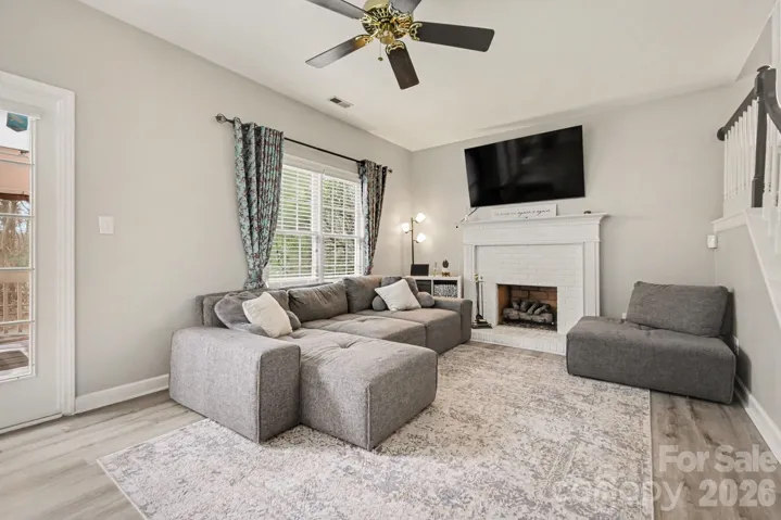 Upstairs, the generous primary suite offers a private retreat with an ensuite bath featuring a double vanity with Corian countertops. Step outside to enjoy the fenced-in backyard complete with a large deck—perfect for grilling and entertaining—as well as an additional patio area that’s ideal for relaxing around a fire pit. Convenient to I-485, shopping, and everything the university area offers.